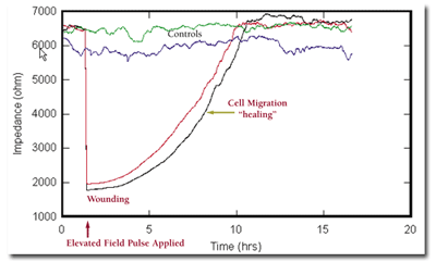 ECIS方法則可以完成自動化分析實驗。當給予電極較強的瞬間電流時,測量電極上的細胞就會被擊穿、損傷,然后有部分細胞死亡。